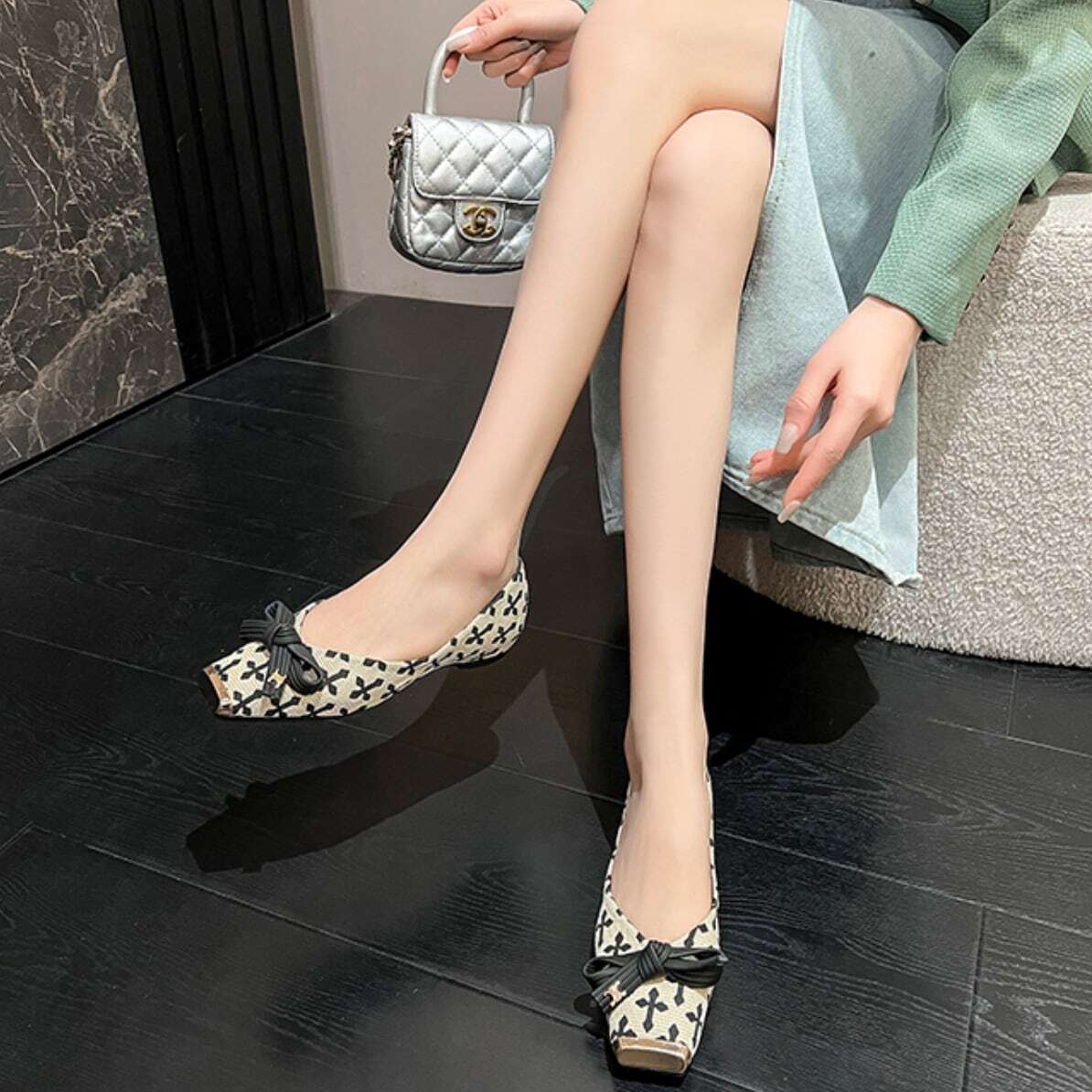 エレガントなクロスパターンが印象的なフラットパンプス。