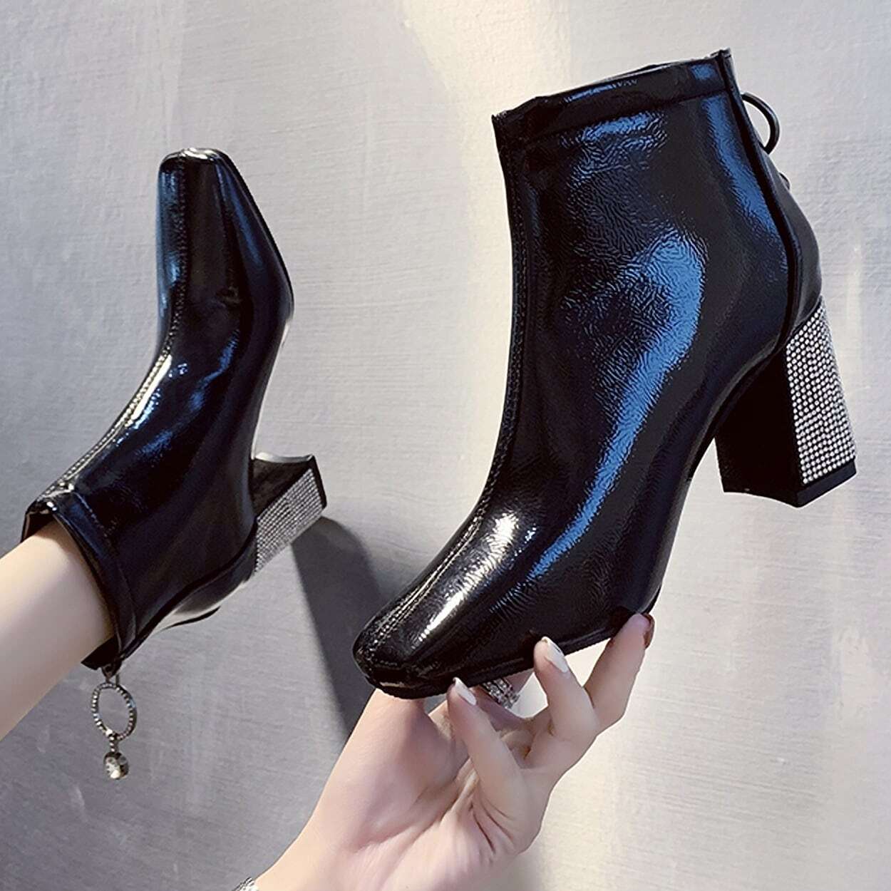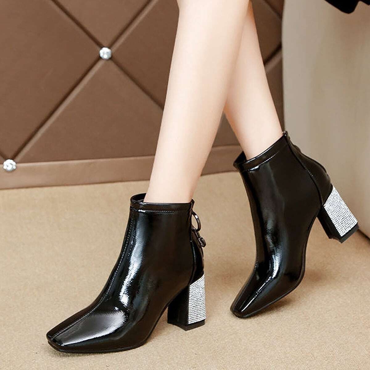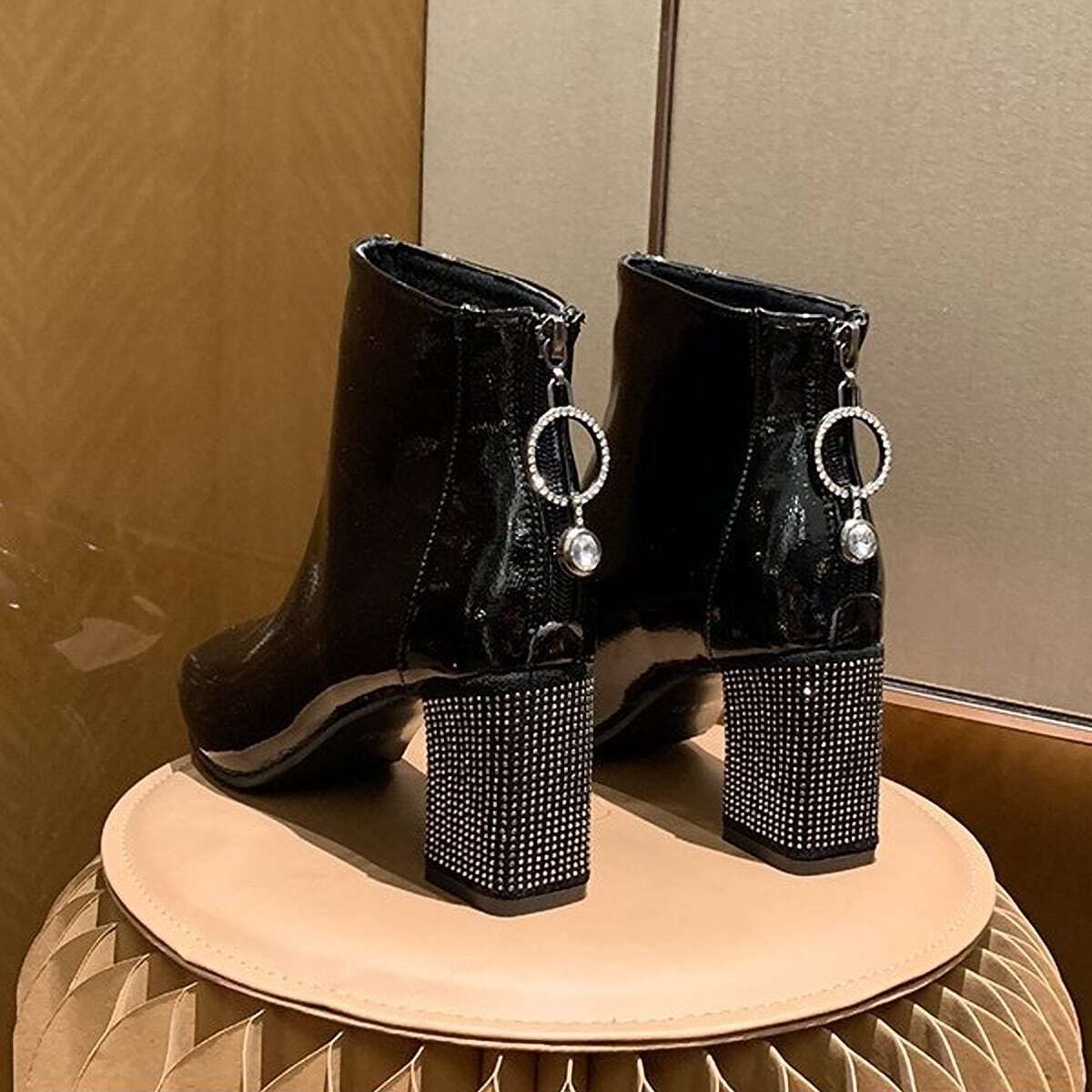 ラインストーンスクエアトゥブーツ F033