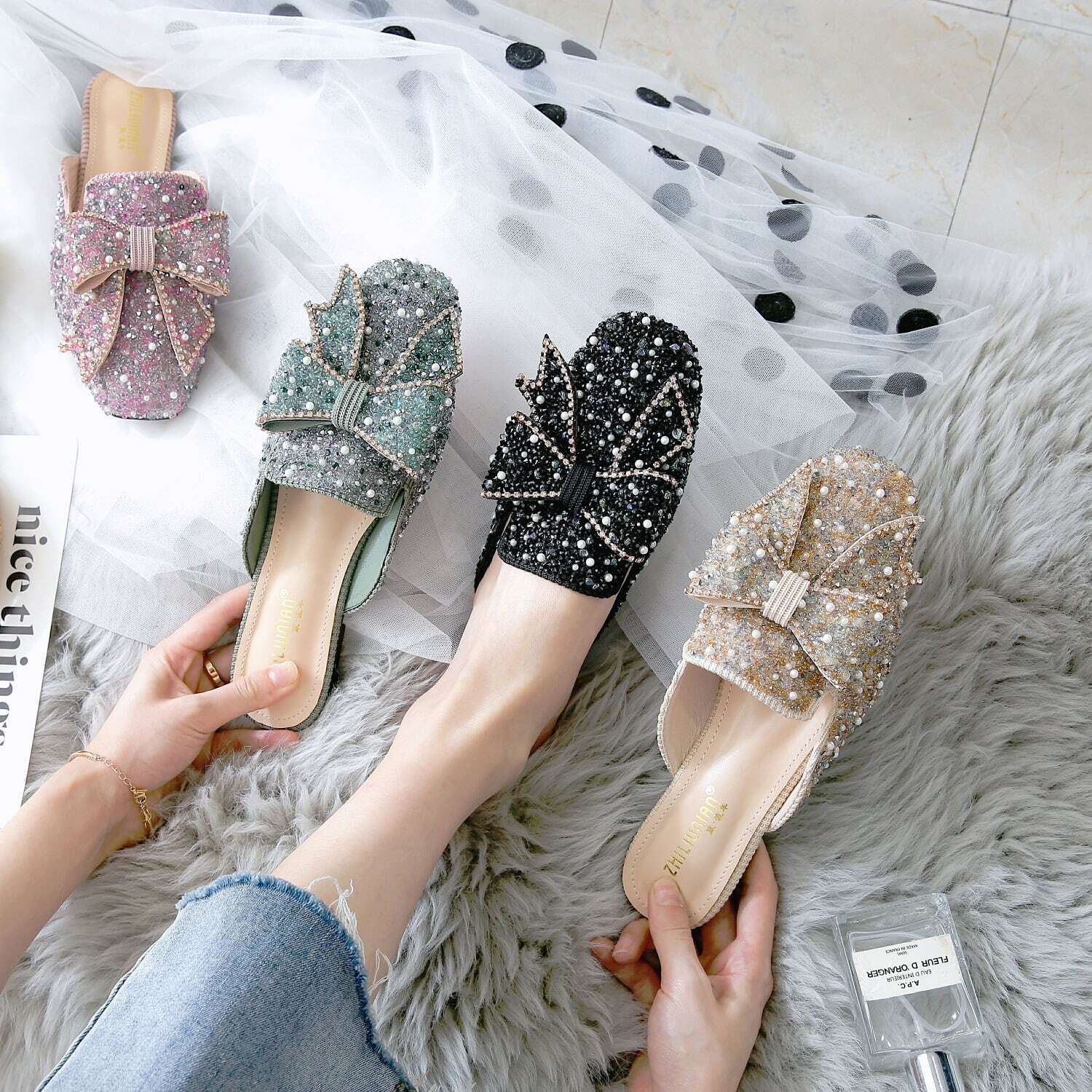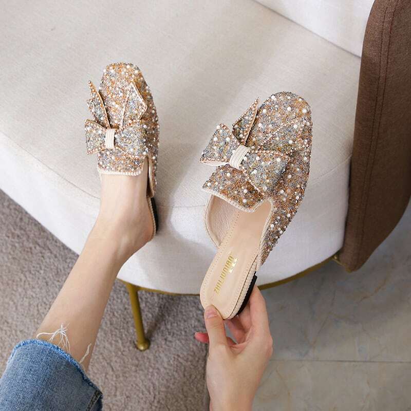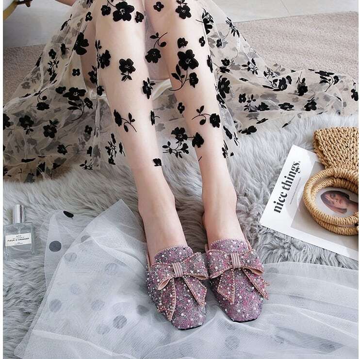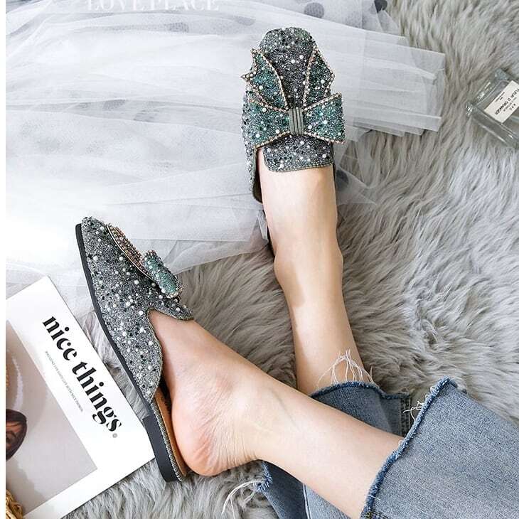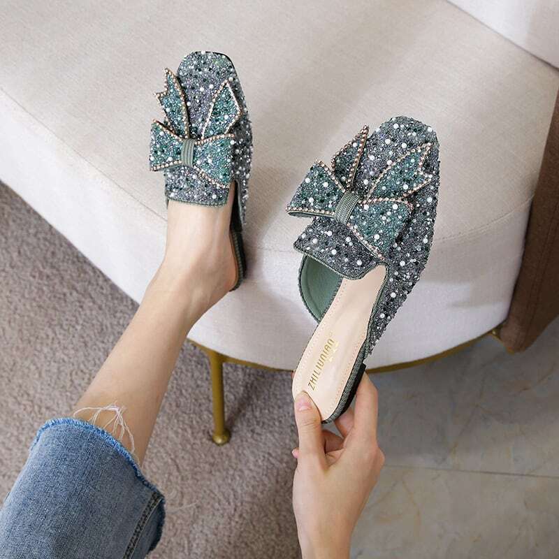 ビーズやパールをふんだんに敷き詰めたミュールに、大振りのリボンがアクセントになっています✧