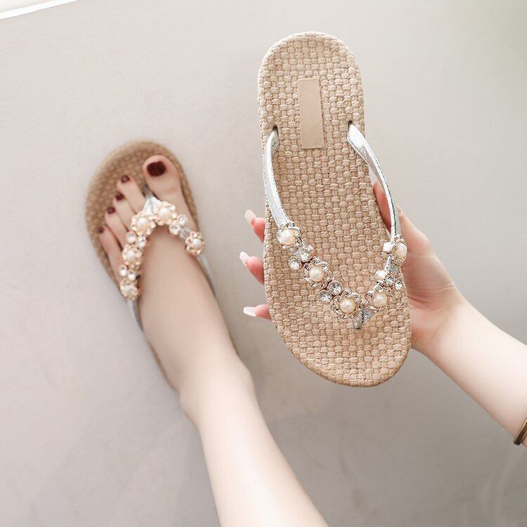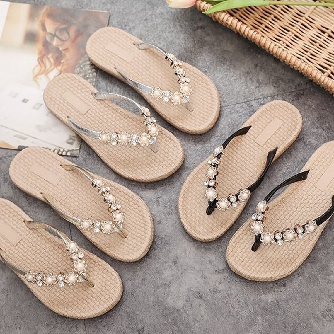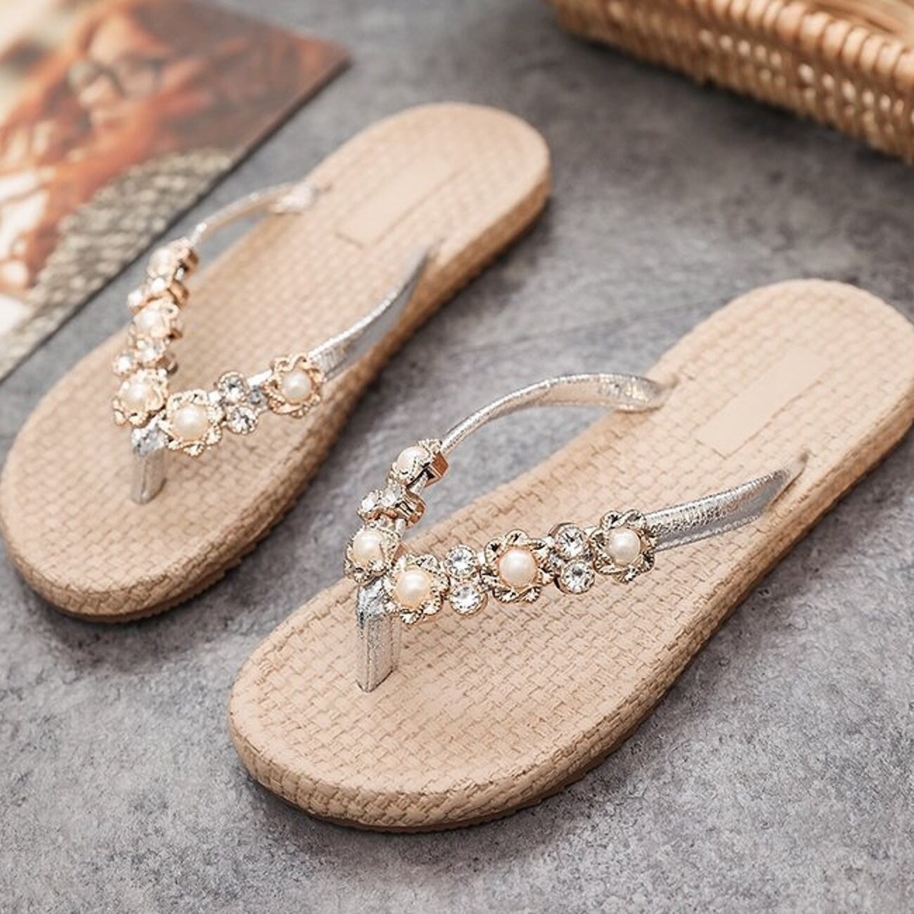 カジュアルなサンダルもパールとクリスタルビジューでワンランク上のアイテムに✧˖°