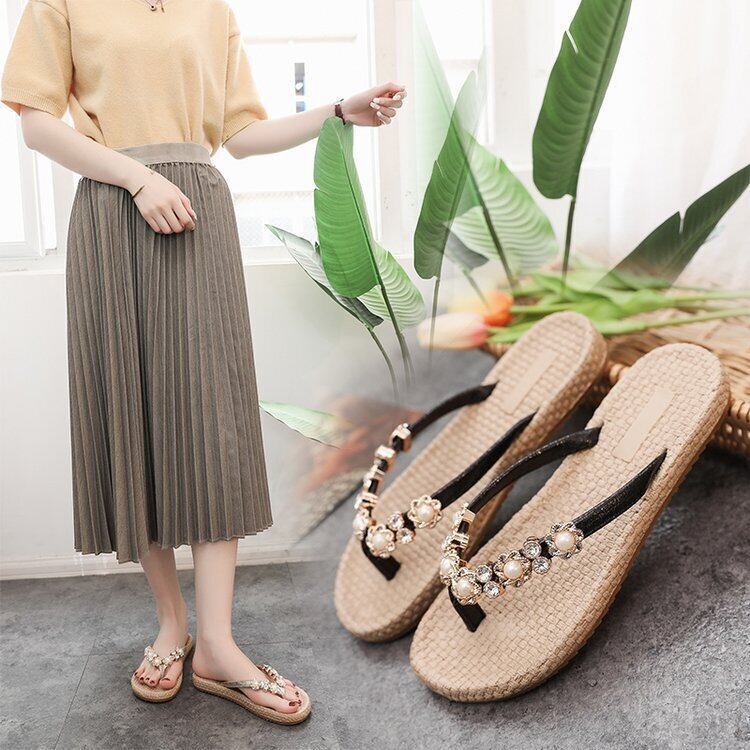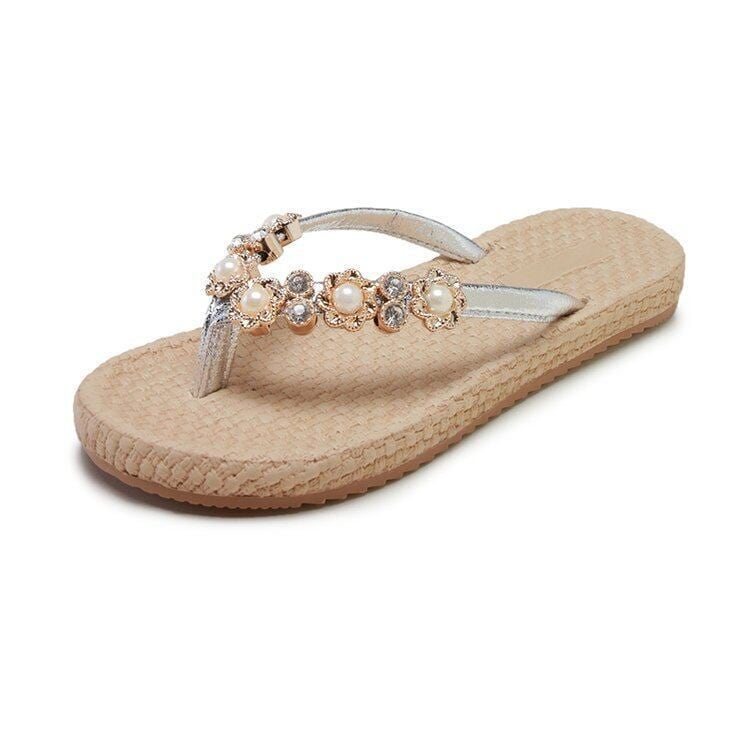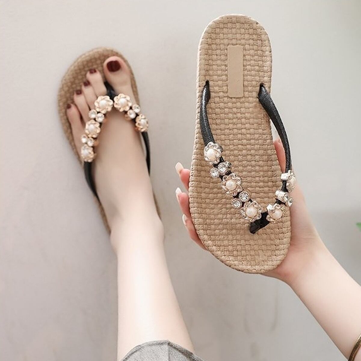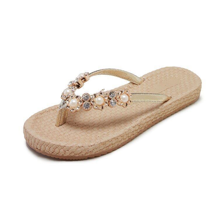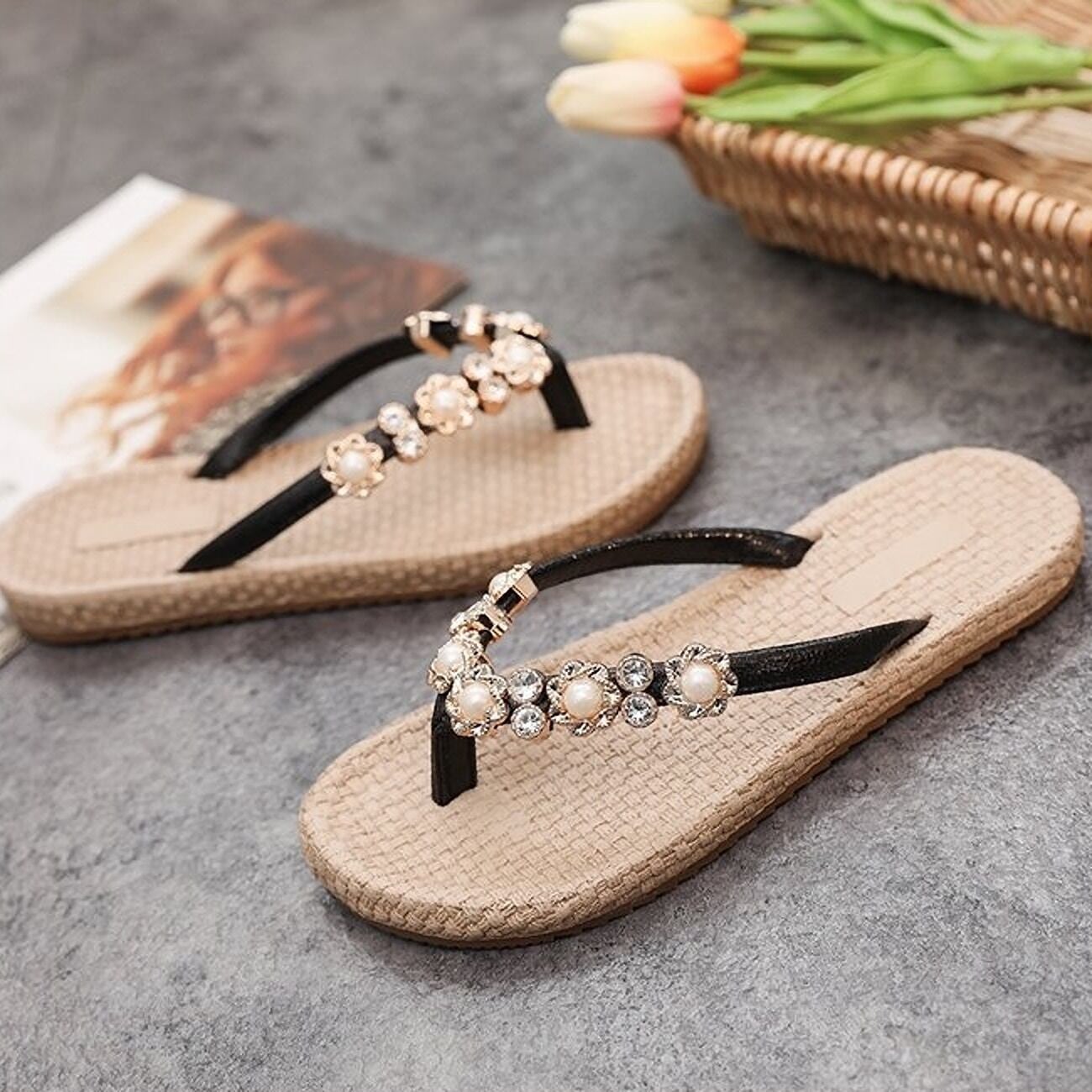 カジュアルなサンダルもパールとクリスタルビジューでワンランク上のアイテムに✧˖°