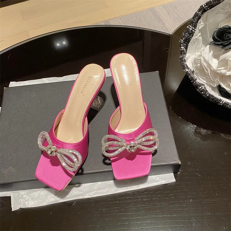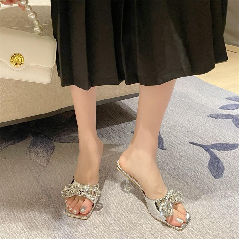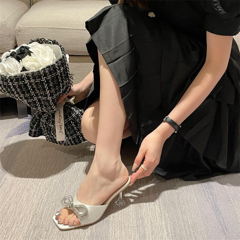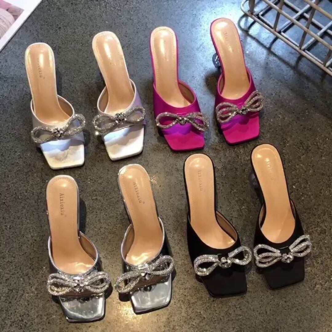 透明感のあるクリアヒールと可愛らしいリボンデザインが印象的なサンダル✧