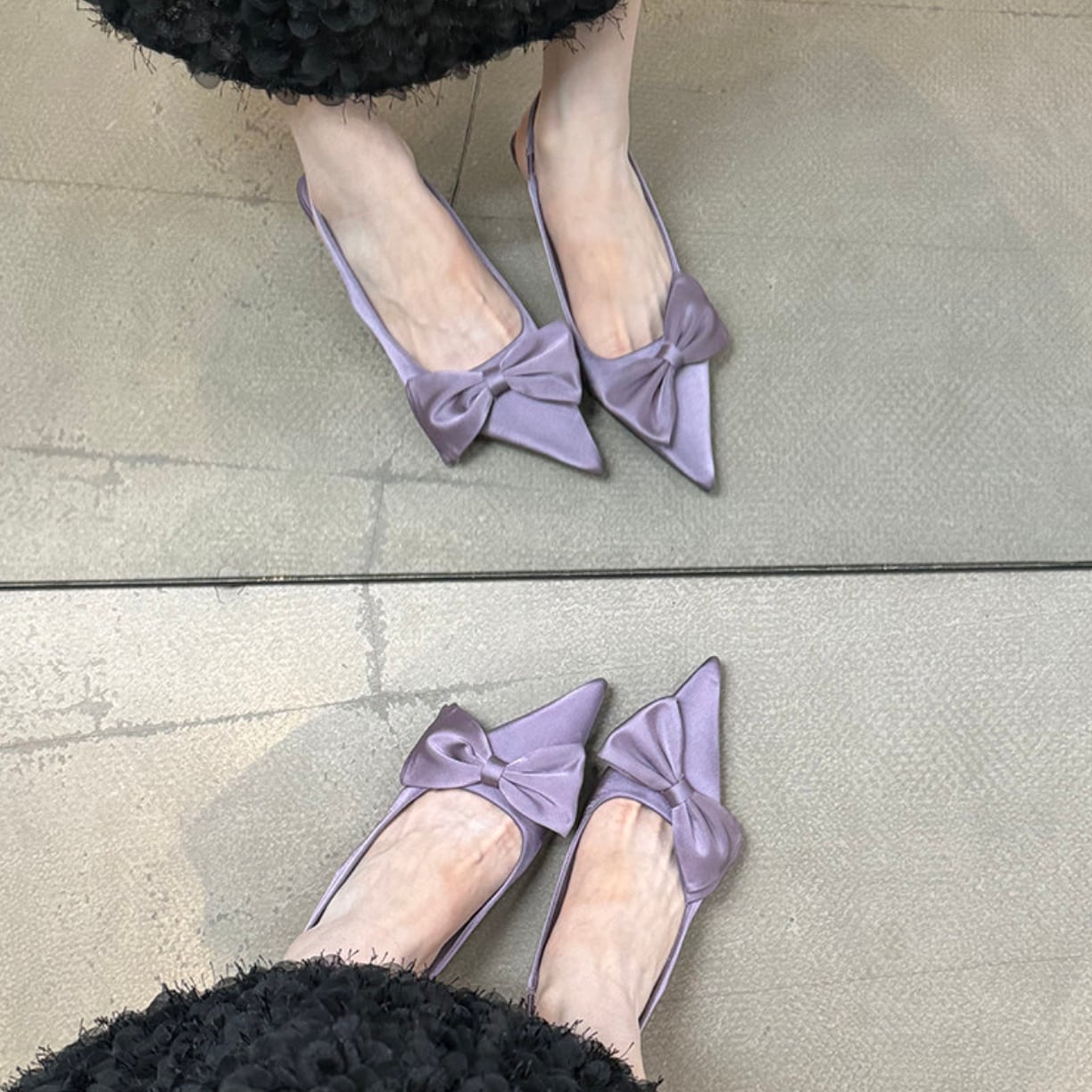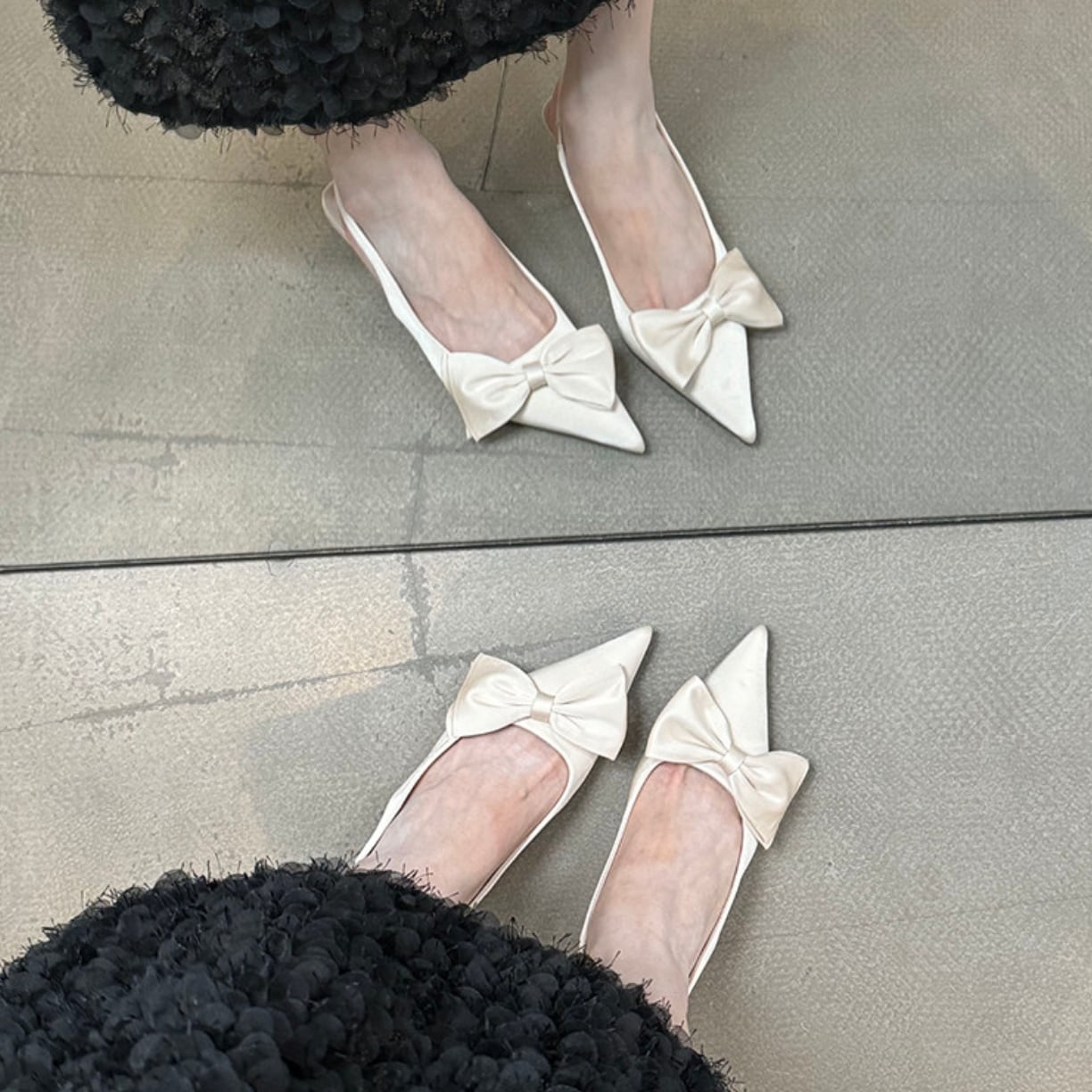 大きめのリボンモチーフが足元にエレガントなアクセントを添えるパンプス。